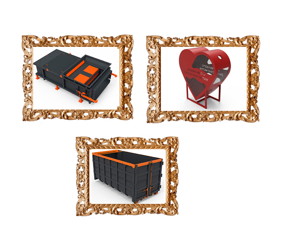 Among other things, waste containers. Such as: waste bins for municipal solid waste (MSW) 0.75 m3, Euro containers for MSW 1.1 m3 with or without a spherical lid, tanks and containers for glass and PET (separate waste), storage bins of 8.0 cubic meters and 10.0 cubic meters, multilifts for hook loaders, and other waste products made to order.